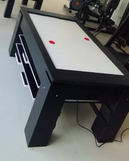 Esta mesa foi feita para quem gosta de muita diversão. Mesa de Aero hockey com estrutura em MDF laminado melamínico, acabamento em primer, tampo revestido com laminado plástico de alta resistência, possui 02 motores ventiladores que proporcionam perfeita flutuação do disco.
