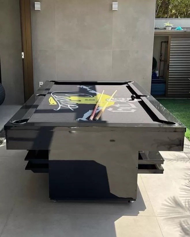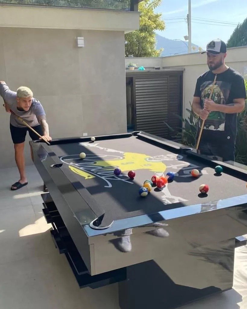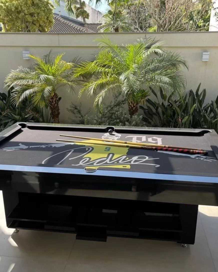 Esta mesa foi entregue ao jogador de futebol Pedro atualmente joga pelo Flamengo e Seleção Brasileira. Mesa de Sinuca Dubai modelo super luxo com estrutura em MDF Lacca laminado melamínico. O campo de jogo é feito de pedra ardósia oficial, polida e calibrada em 100%. O tecido utilizado é o acrílico Thaís.