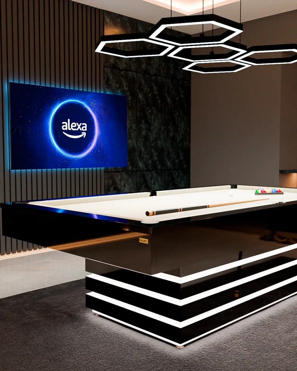 A Mesa de Sinuca Space é a união perfeita entre luxo, entretenimento e tecnologia. Com seu design exclusivo, sistema de áudio de alta performance e a inteligência da Alexa, ela oferece uma experiência inigualável, transformando qualquer ambiente em um espaço de diversão e automação inteligente. Adquira a Mesa Space e eleve seu estilo de vida a um novo patamar.