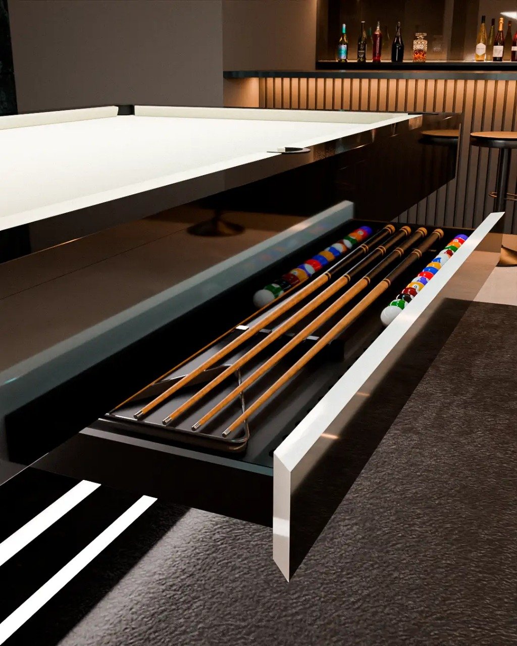 A Mesa Space se destaca pelo seu design inovador e acabamento impecável. Sua base, que abriga um gaveteiro com corrediças invisíveis, oferece um armazenamento discreto e elegante para todos os acessórios do jogo, como bolas, triângulo, giz, escova de limpeza e tacos.