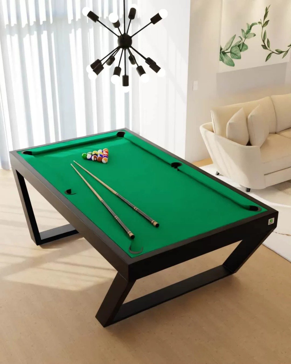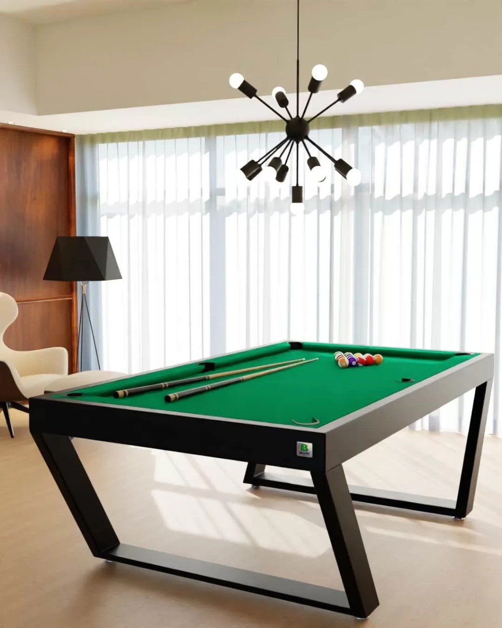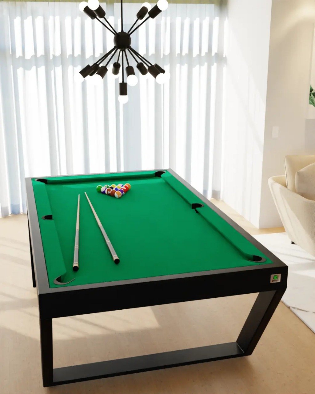 Apresentamos a mesa de sinuca Londres linha industrial (estrutura em ferro galvanizado) com sistema de redinha embutida, a escolha perfeita para quem busca ter uma mesa de sinuca e desfrutar de momentos divertidos. Nossa mesa é construída com materiais de alta qualidade, recomendados pela CBBS – Confederação Brasileira de Bilhar e Sinuca, garantindo uma experiência de jogo profissional.