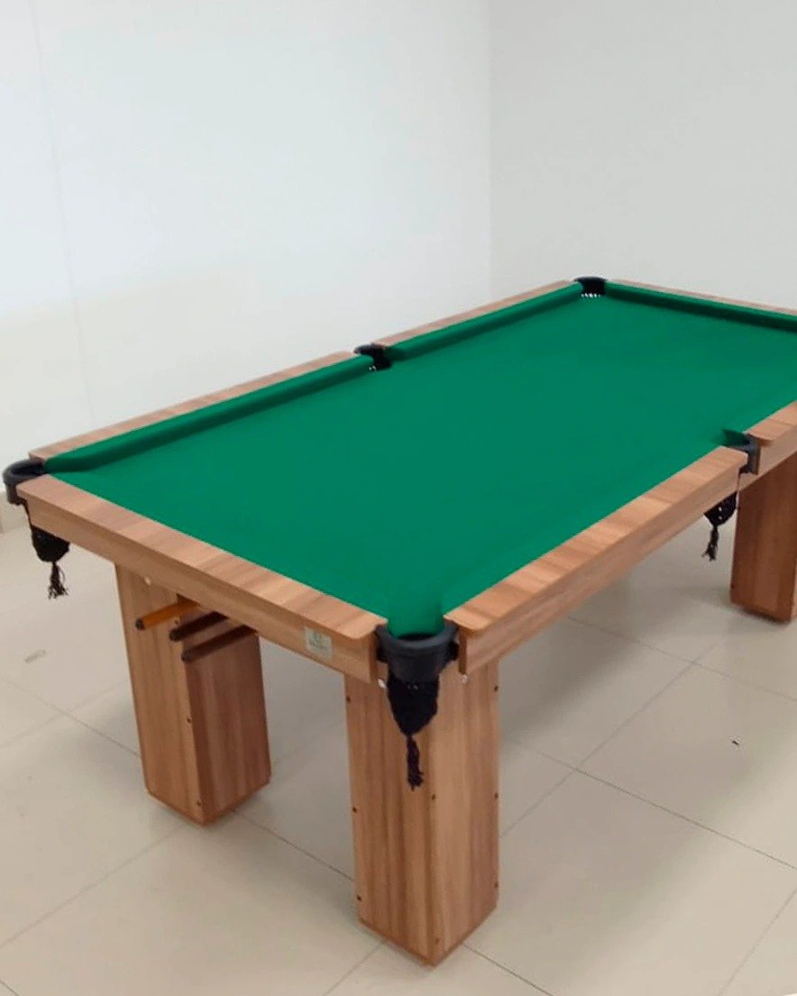 Tecido acrílico Thaís (recomendado pela confederação brasileira de bilhar e sinuca) deixando a jogada mais rápida, tecido com melhor tecnologia e tradição europeia.