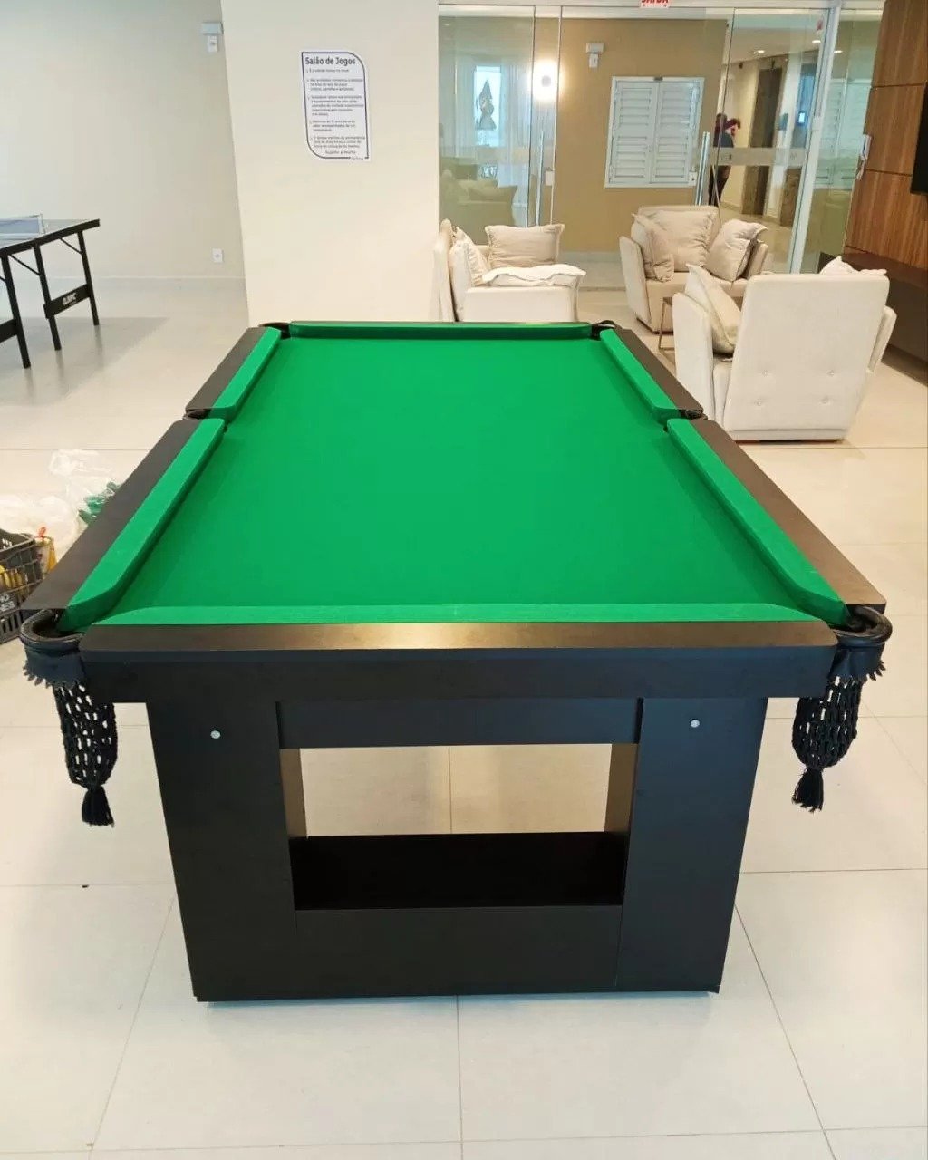 Recomendado ter um espaço de 1,40m em cada lado da mesa para evitar que o taco bata na parede ou em objetos próximos. A mesa não possui gaveta, as bolas são retiradas diretamente na caçapa. As cores podem ter pequenas alterações devido a variação de monitor para monitor.