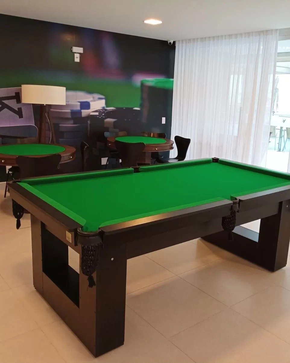 Tecido acrílico Thaís (recomendado pela confederação brasileira de bilhar e sinuca) deixando a jogada mais rápida, tecido com melhor tecnologia e tradição europeia.