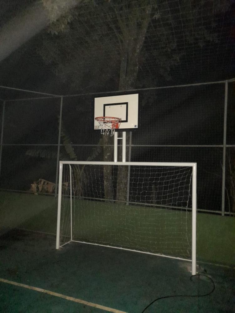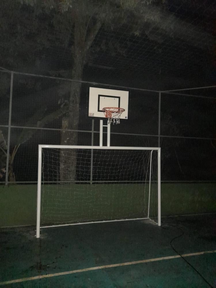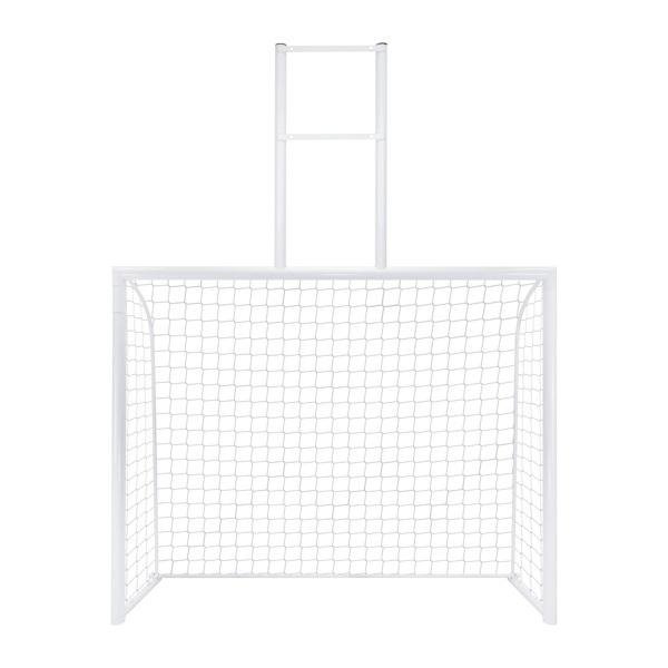Trave de Futsal em tudo de aço carbono 3”, de 3,00 x 2,00 m, com ganchos para fixação da rede, requadro em tubo de 1”, acabamento em esmalte sintético automotivo com suporte para tabela de basquete.
