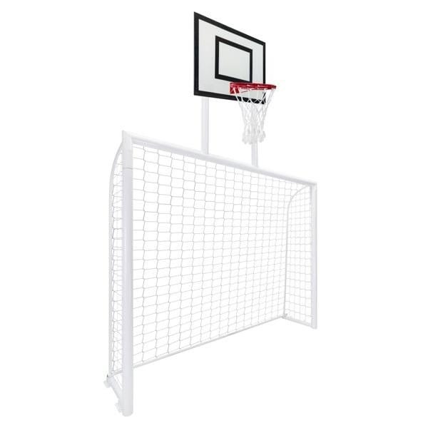 TRAVE DE FUTSAL CONJUGADA 3,00 x 2,00 metros COM TABELA DE BASQUETE NAVAL 18 mm DE 1.10 X 0.80 metros C/ ARO SIMPLES E REDE – PAR